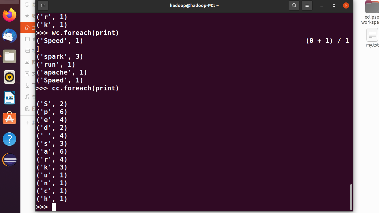 >>> lines = sc.textFile("file:///home/hadoop/my.txt")