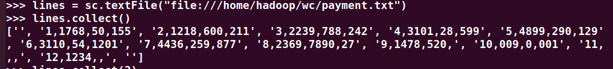 >>> text = sc.textFile("file:///home/hadoop/wc/f1.txt")
