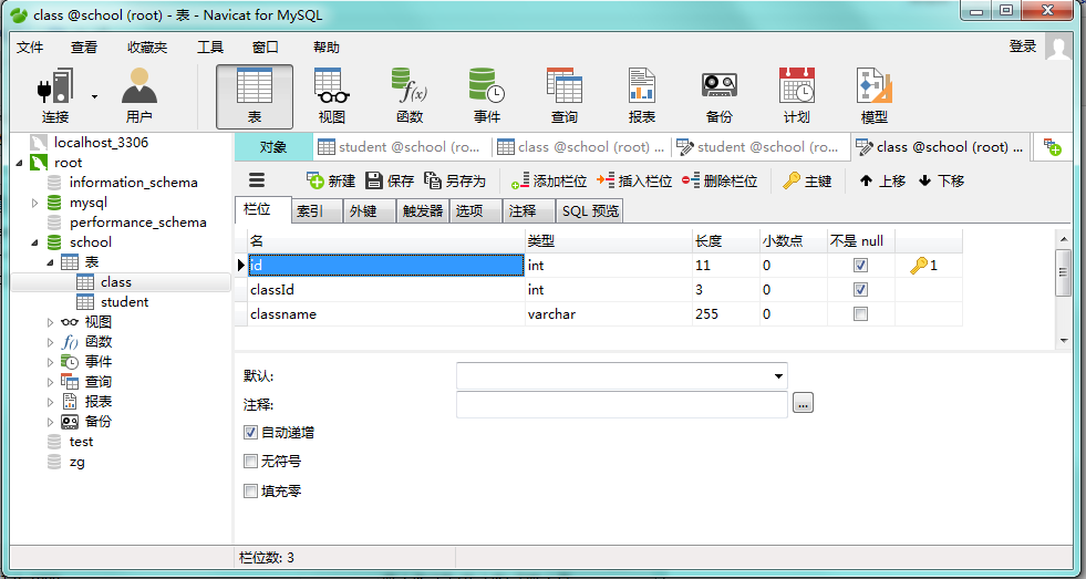 新建表->添加字段(添加栏位)->字段名->类型->长度(可以默认)->是否加小数点->是否值为null