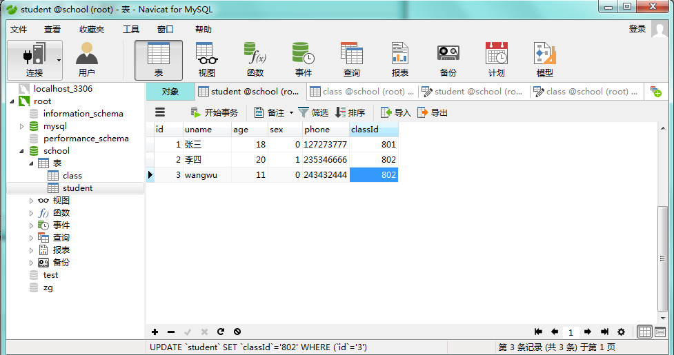 设置外键成功(classId只能从相关联的表中获取,如果相关联的表中没有相关的数据就报错):