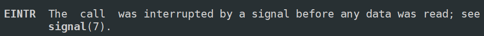 其实在读取的时候,还要一种情况叫EINTR、, 表示返回并不是因为读取时非阻塞或者其他,有可能是对应的读取被信号中断了,所以只要报错是EINTR 说明底层数据可能还没有读完,但是也以-1形式返回,它不算读取错误,它是底层读取被中断了,需要下次再重新读。