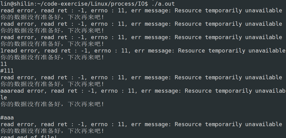 经过测试发现errno是11,表明它不是真的错了,而是底层数据没有就绪,可以在看看11代表的是资源暂时没有就绪