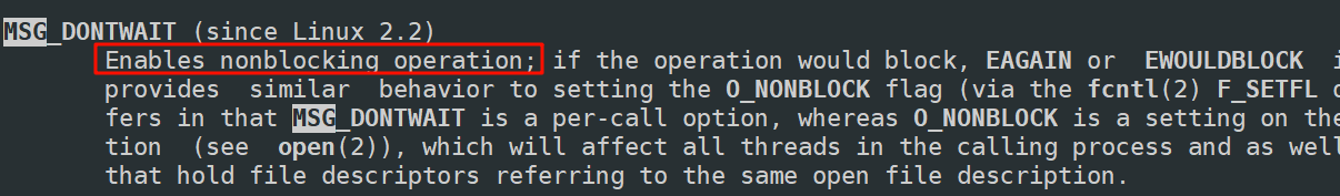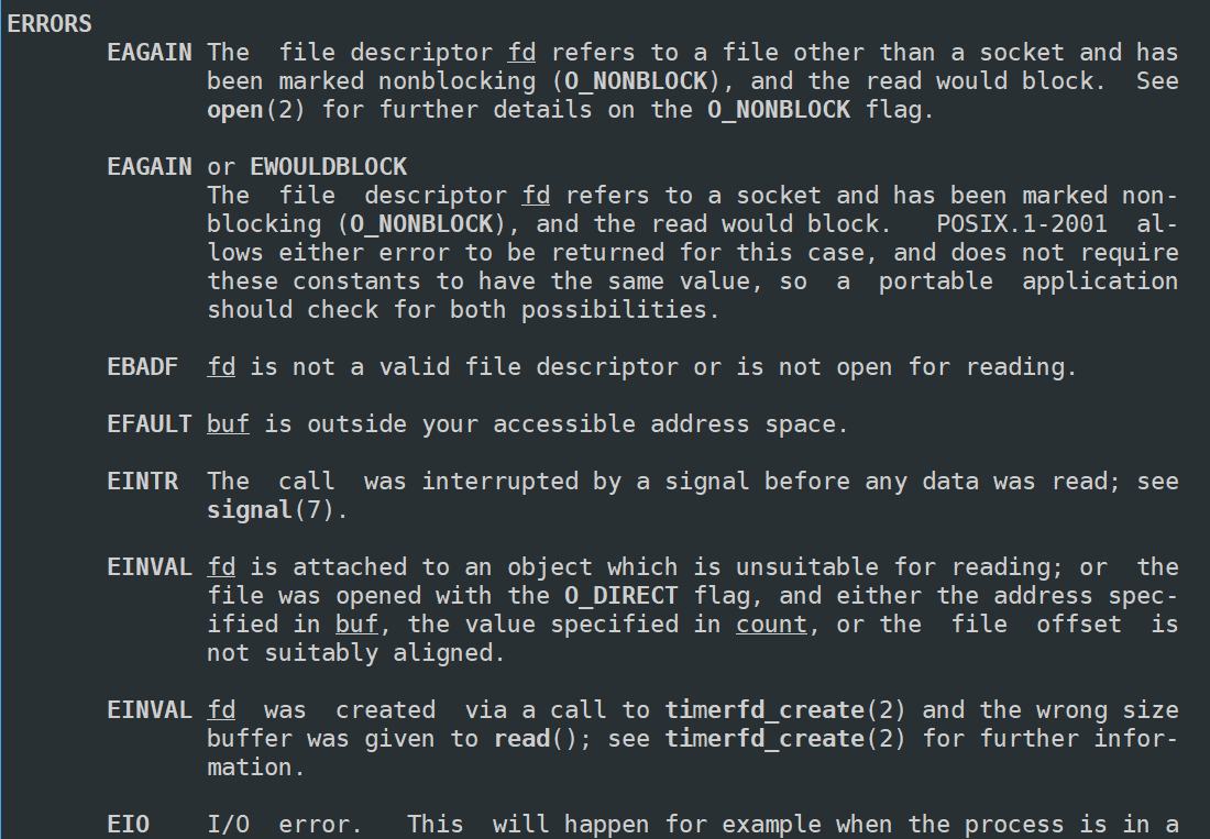 如果对应的文件描述符曾经被设置为非阻塞,那么当读取的时候本来应该阻塞的,但是你可能非阻塞立马返回,返回值以出错的形式-1返回,但错误码errno被设置成EAGAIN或EWOULDBLOCK。