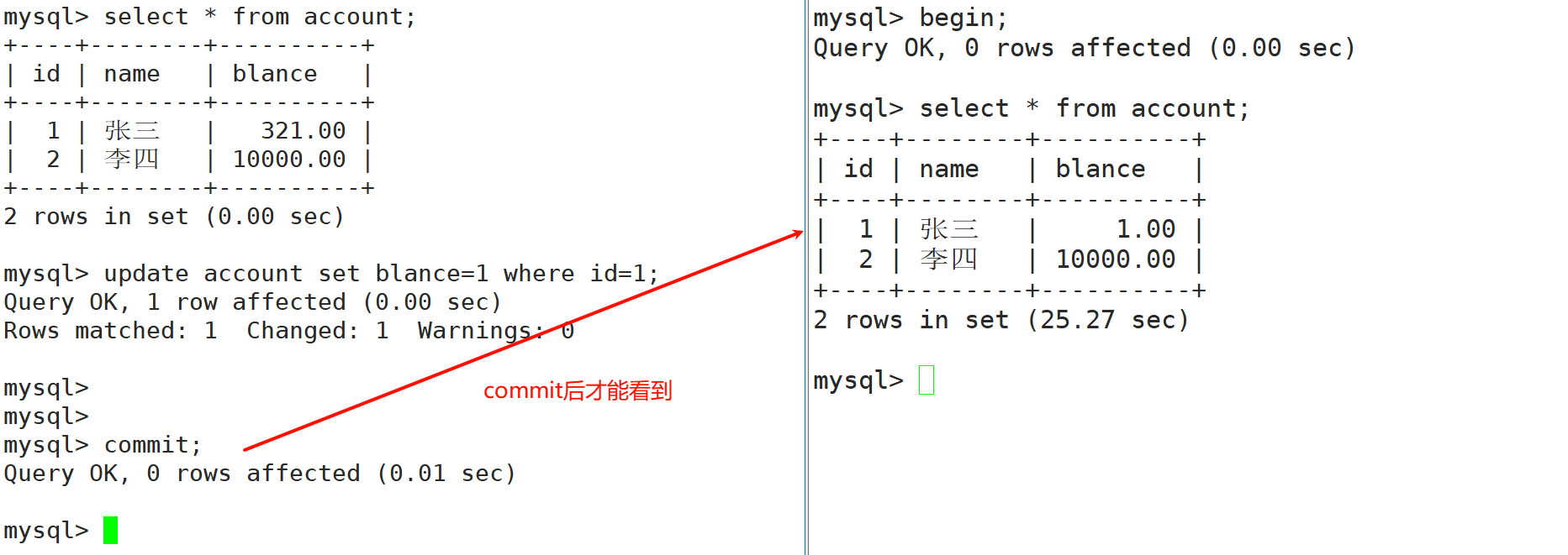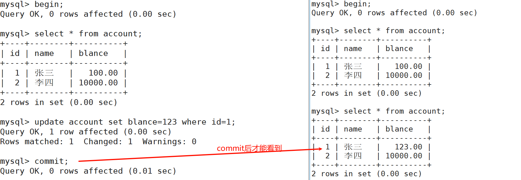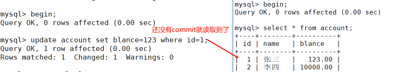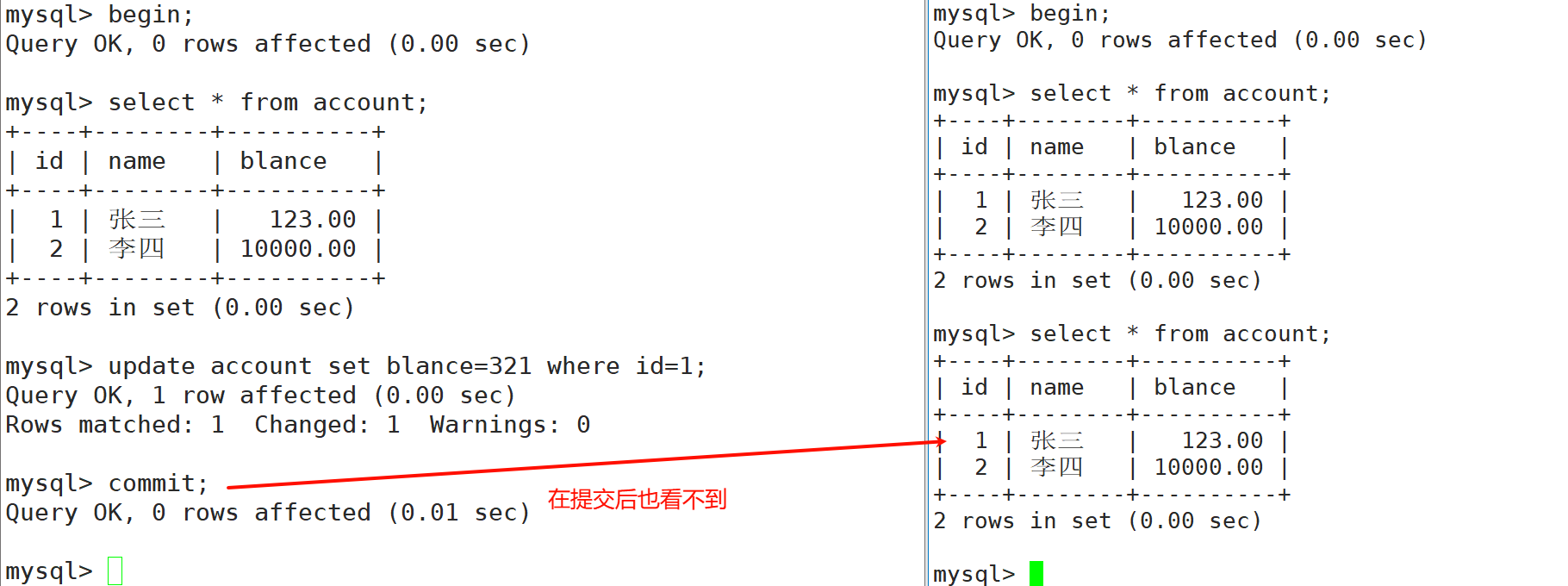 此时还在当前事务中,并未commit,那么就造成了,同一个事务内,同样的读取,在不同的时间段(依旧还在事务操作中!),读取到了不同的值,这种现象叫做不可重复读(non reapeatable read)!!