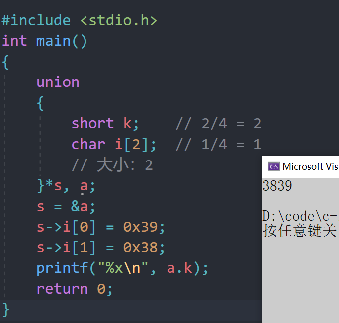 a.k,我们上面所操作的是数组,但是不要忘了这个数组是在联合体内部的,对于联合体来说最大的一个特征就是【所有成员共享同一块空间】,那么此时k的值也发生了变化,因此我们去打印k的值就相当于是在打印数组的值,最后的结果即为[3839]