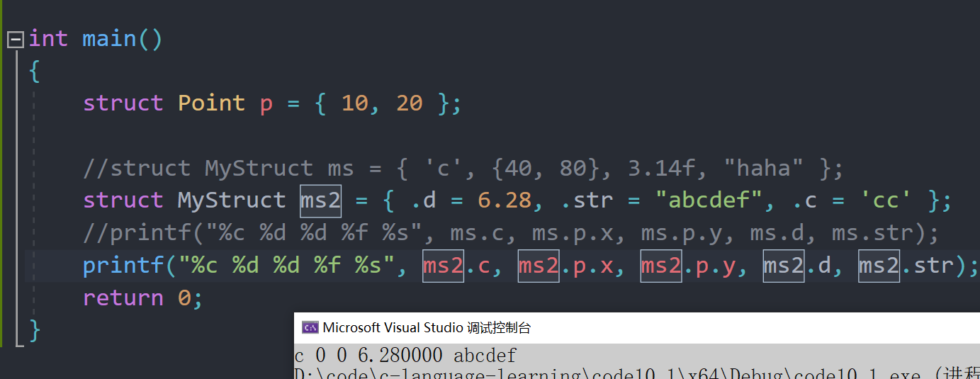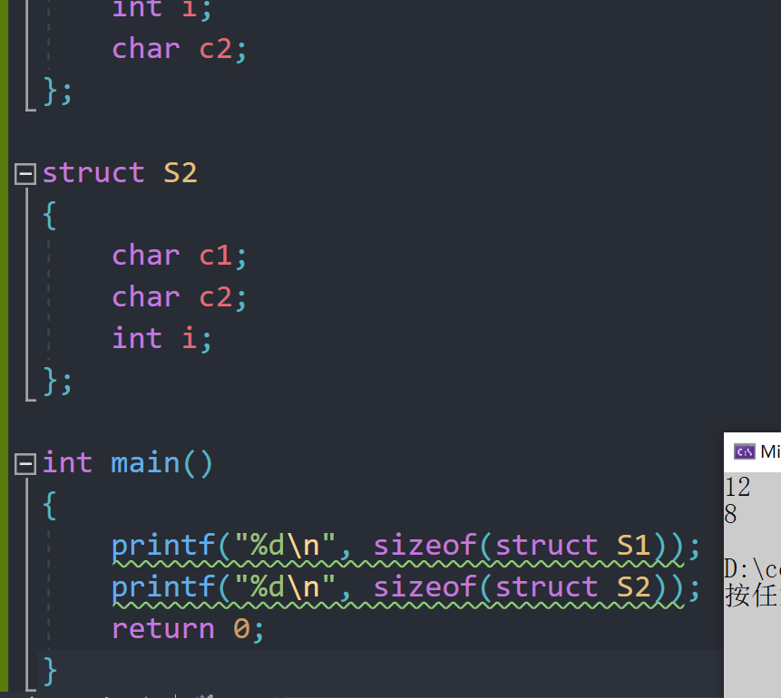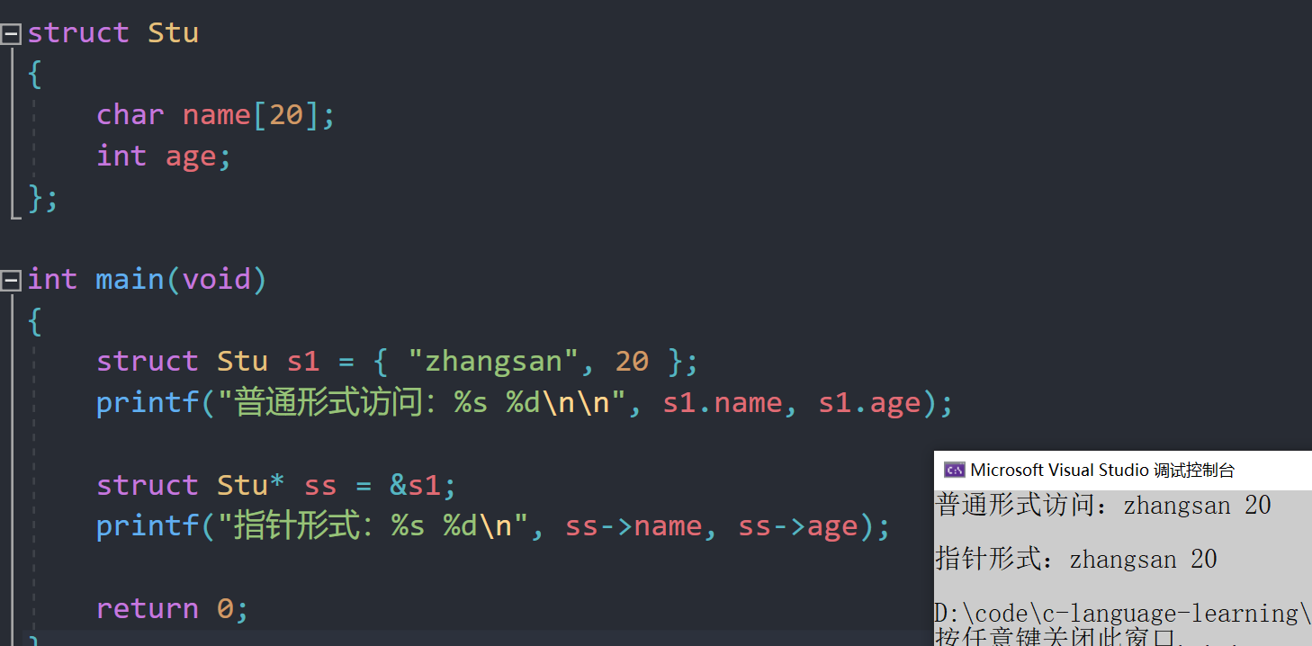 - 可以看到,我故意将两个结构体的内容设置成一样,然后直接在声明的时候就定义出了它们各自的结构体成员,第二个结构体定义了一个结构体数组和结构体指针