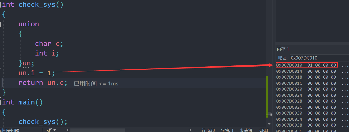 0x00EFF99C这块地址上的第一个字节即01,这个时候我们去return un.c的时候就是把这个01给返回回去了,使用int整型来接受即为1,所以最后打印的结果就是【小端】
