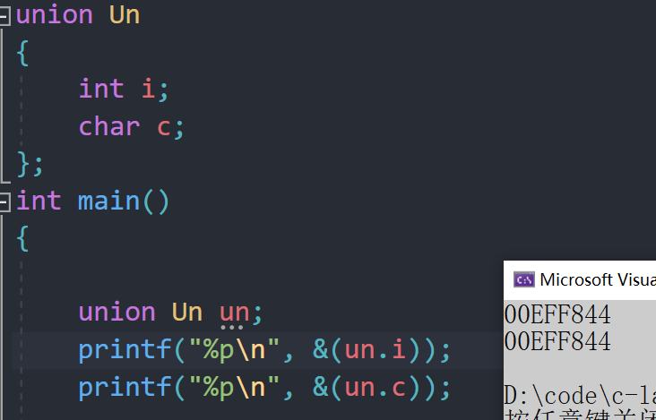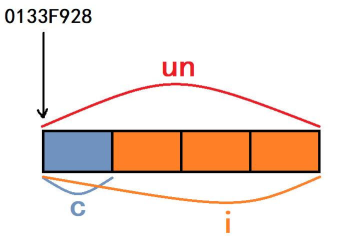 c和int类型的变量i,前者占1个字节,后者占4个字节,此时变量【c】就是从[0122F928]这块地址开始放置,总共的话就占一个字节。那既然编译器为联合体un就分配了4个字节的空间,而且变量【i】也是从[0122F928]这块地址开始放置,总共也就占这4个字节 - 那其实就很清晰可以看出:对于联合体内部的成员都是共用一块地址空间的,这样一个联合变量的大小,至少是最大成员的大小(因为联合至少得有能力保存最大的那个成员)