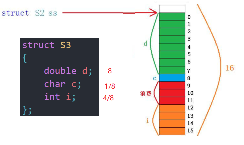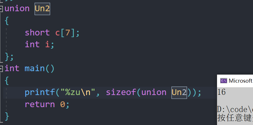 i即为4,那它的大小是多少呢?c数组中的元素个数所占大小为2B,和8一比即为2,i类似,因为现在已经存放了14个字节的大小,我们要对齐到最大对齐数的整数倍,即为【16】,因此最后计算出来的联合体的大小就为16