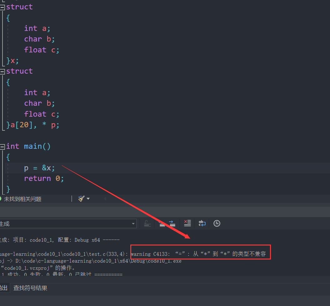 - 此处我使用这个结构体指针去接收第一个结构体定义出来的变量x,此时你应该会觉得合情合理,但是编译之后却看到【它们的类型不兼容】,这是为什么呢?
