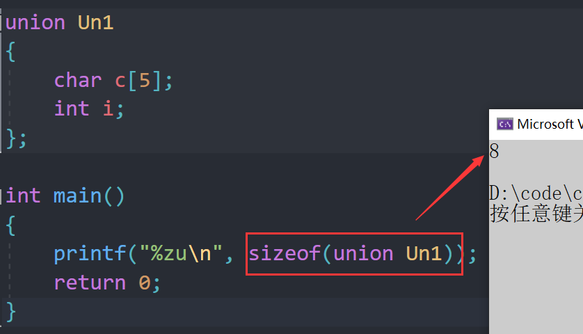 - 很简单,字符数组c中的每一个元素在内存中所占大小为1个字节,VS默认对齐数为8,即为1;成员【i】在内存中所占大小为4个字节,VS默认对齐数为8,即为4;因为现在已经存放了5个字节的大小,我们要对齐到最大对齐数的整数倍,即为【8】,因此最后计算出来的联合体的大小就为8