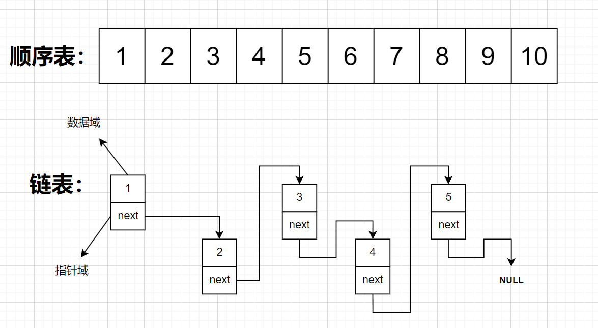 - 其实对于链表的单个结点来说,是由两个域组成的,一个叫做【数据域】,是存放结点数据的,一个叫做【指针域】,是存放下一个结点在堆内存中地址,图示如下: