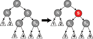 我们首先以二叉查找树的方法增加节点并标记它为红色。(如果设为黑色,就会导致根到叶子的路径上有一条路上,多一个额外的黑节点,这个是很难调整的。但是设为红色节点后,可能会导致出现两个连续红色节点的冲突,那么可以通过颜色调换(color flips)和树旋转来调整。)下面要进行什么操作取决于其他临近节点的颜色。同人类的家族树中一样,我们将使用术语叔父节点来指一个节点的父节点的兄弟节点。注意: