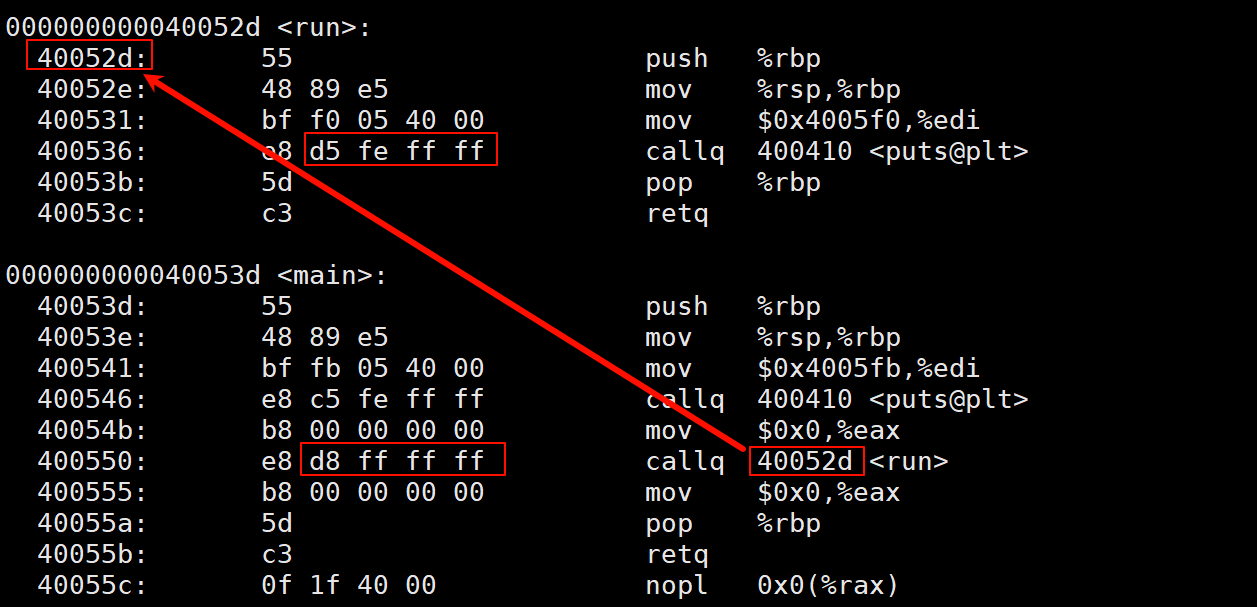 400550: e8 d8 ff ff ff callq 40052d <run>