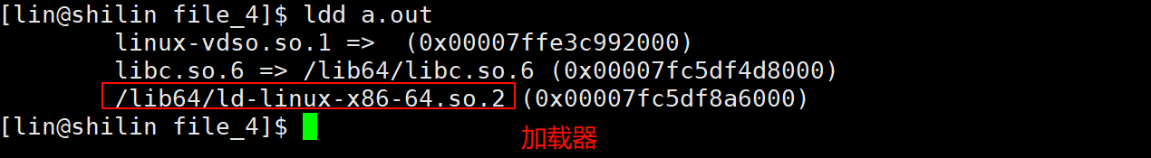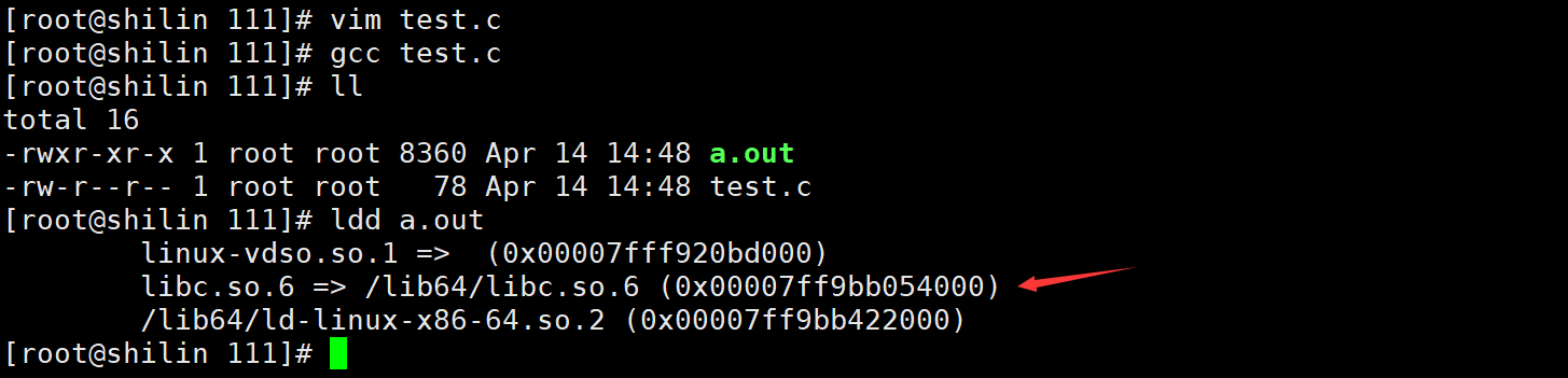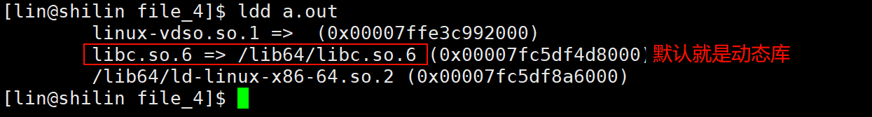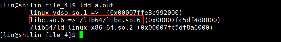 使用ldd查看我们写的可执行程序,会看到链接了一个C语言库。