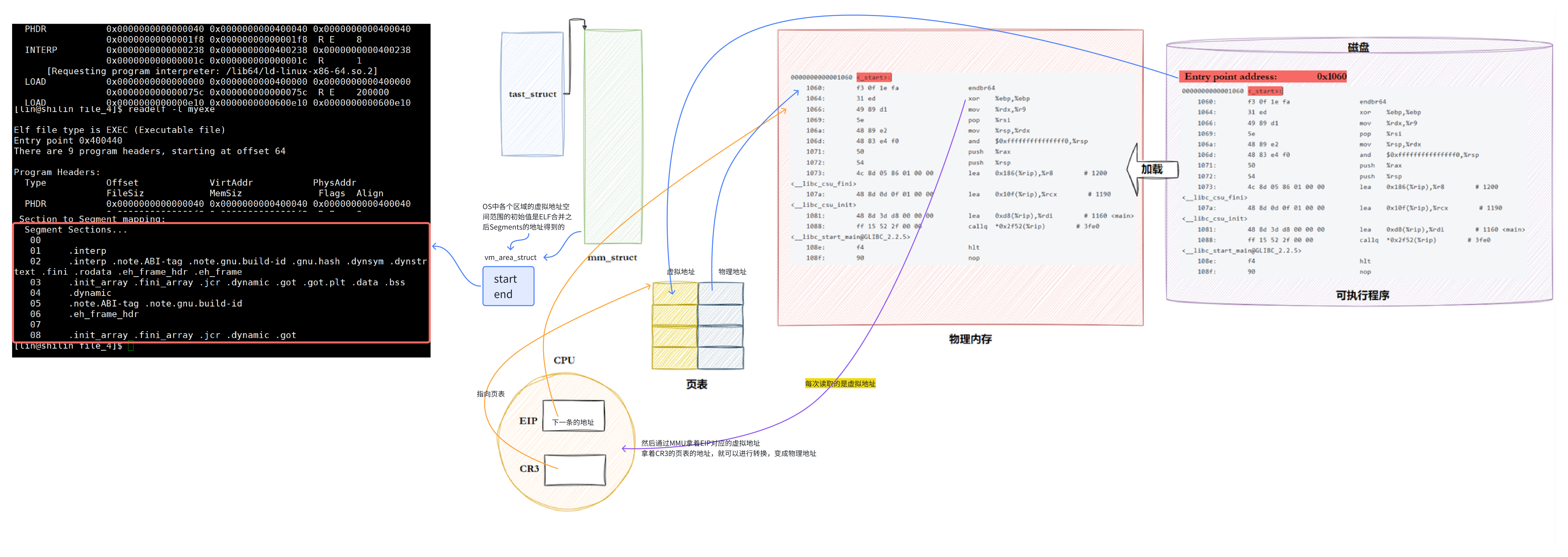 进程mm_struct、vm_area_struct在进程刚刚创建的时候,初始化数据从哪里来的?从ELF各个segment来,每个segment有自己的起始地址和自己的长度,用来初始化内核结构中的[start, end]等范围数据,另外在用详细地址,填充页表。