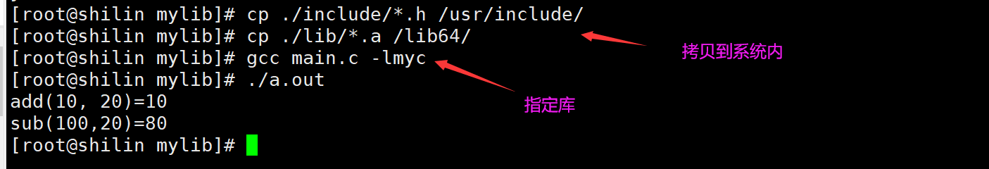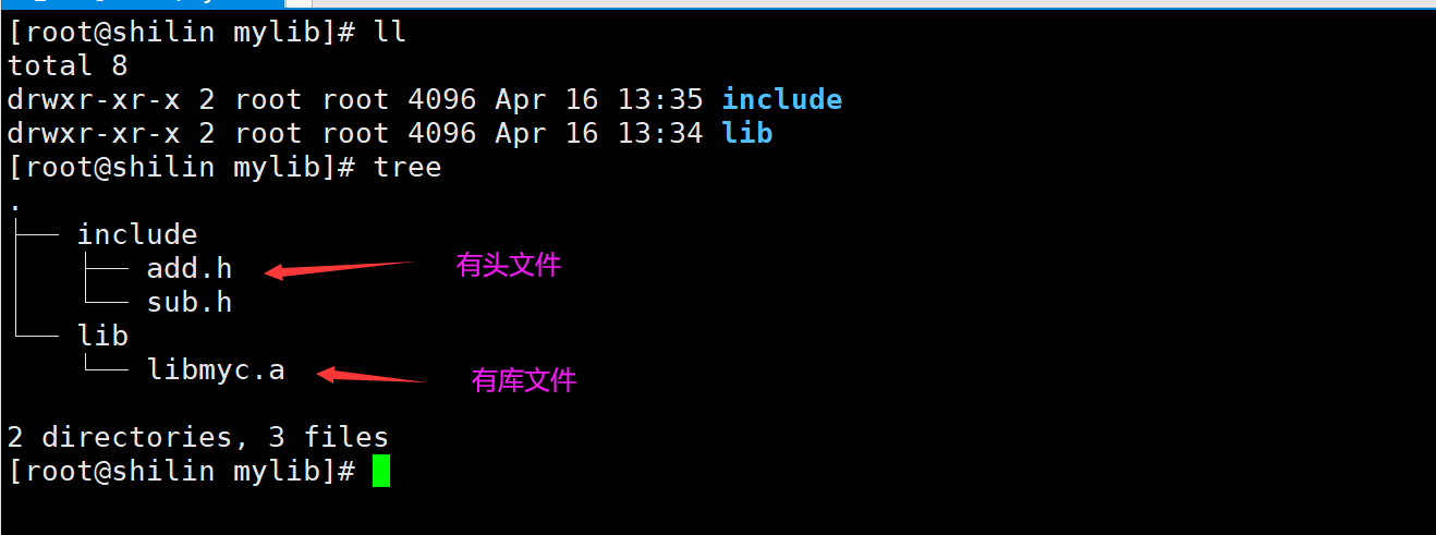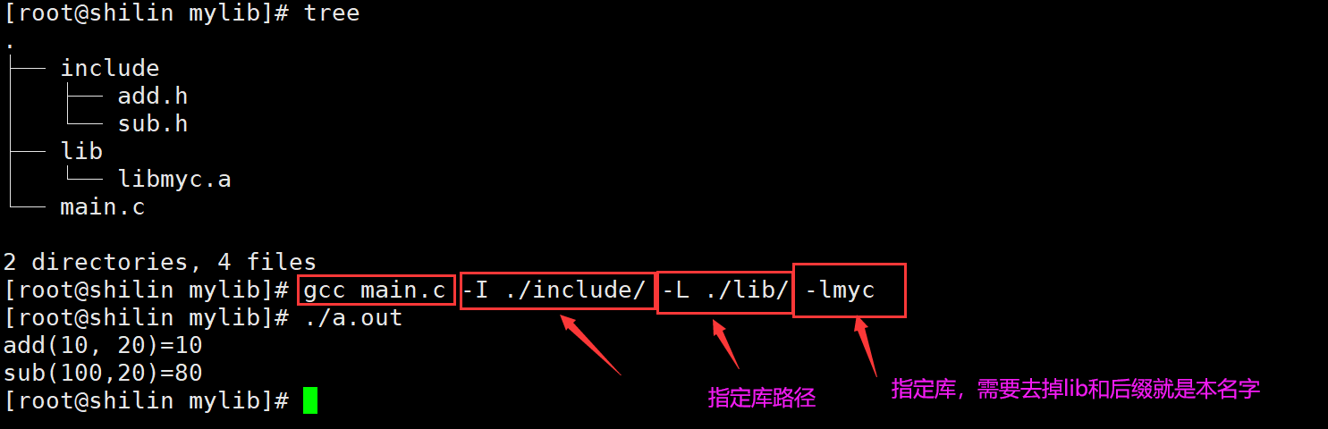 我们可以将add.h和sub.h这两个头文件放到一个名为include的目录下,将生成的静态库文件放到一个名为lib的目录下