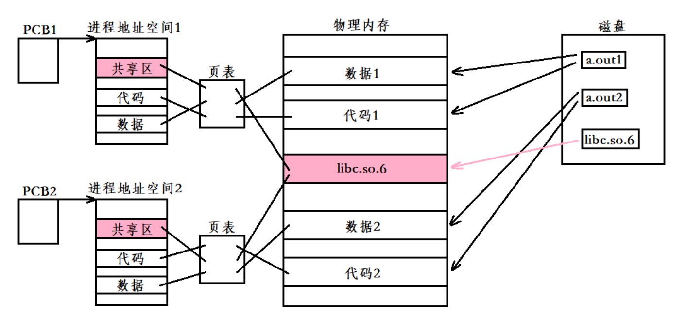 - 而且:整个调用过程,是从代码区跳转到共享区,调用完毕在返回到代码区,整个过程完全在进程地址空间中进行的。