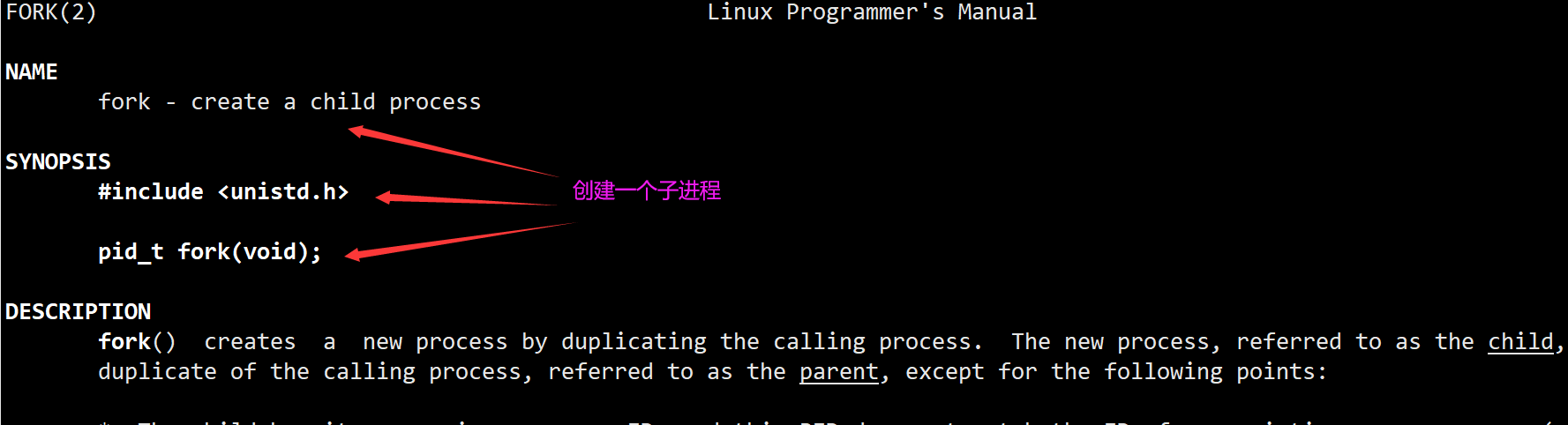 在上图中我们还可以看到返回类型是pid_t,如果创建子进程失败,会返回小于0的数字,而如果创建子进程成功,该函数则会返回俩个值。它会给子进程返回0值,而给父进程返回子进程的pid(一个大于0的数),创建成功后我们可以对此进行使用if语句进行分流