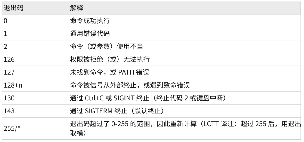 退出码(退出状态)可以告诉我们最后一次执行的命令的状态。在命令结束以后,我们可以知道命令是成功完成的还是以错误结束的。其基本思想是,程序返回退出代码 0 时表示执行成功,没有问题。代码1或0以外的任何代码都被视为不成功。