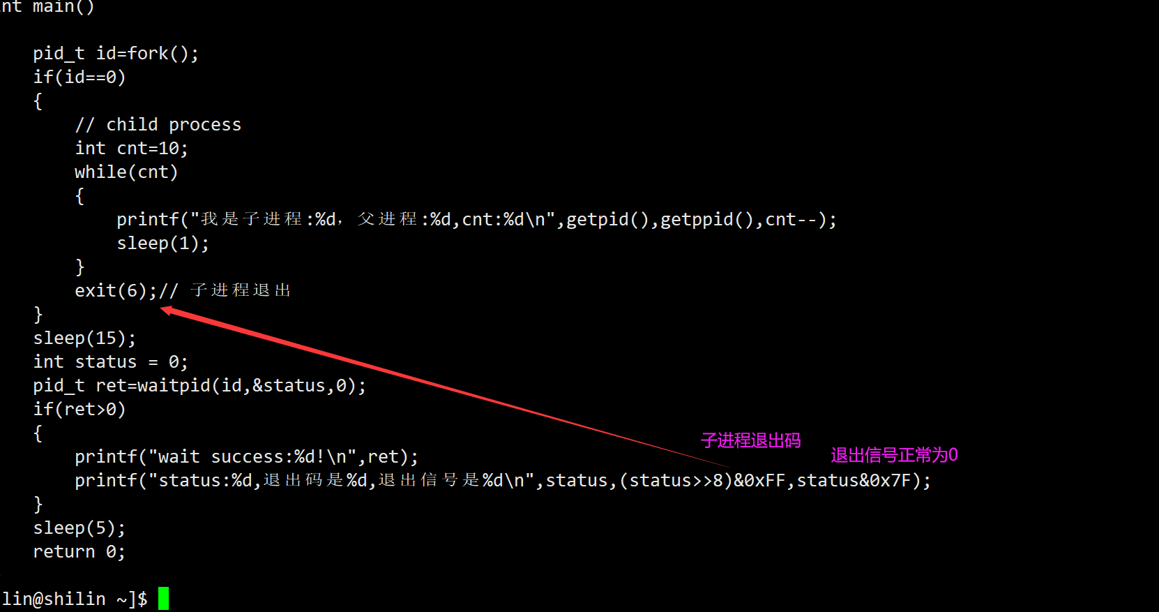 stauts定义了进程的终止状态,由用户自己传递,父进程可以通过wait来获取该值