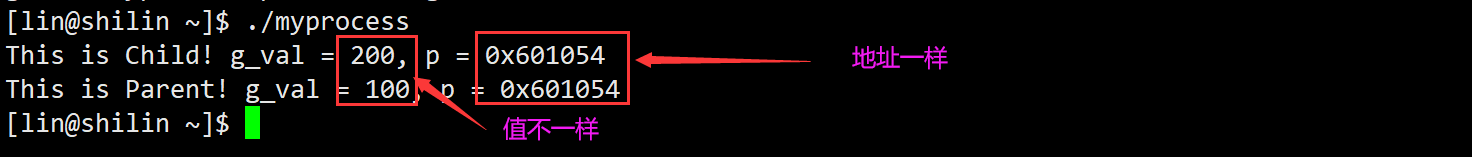 printf("This is Parent! g_val = %d, p = %p\n",g_val,&g_val);