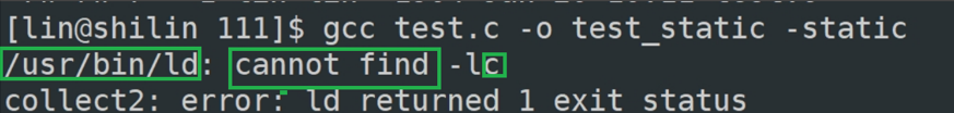 -static静态链接是无法生成的,因为gcc默认没有安装静态库,提示下面的信息