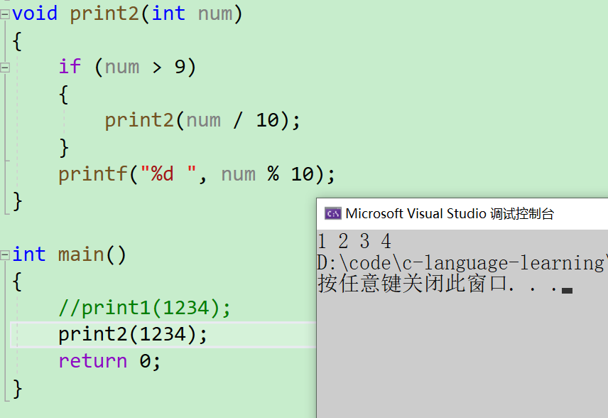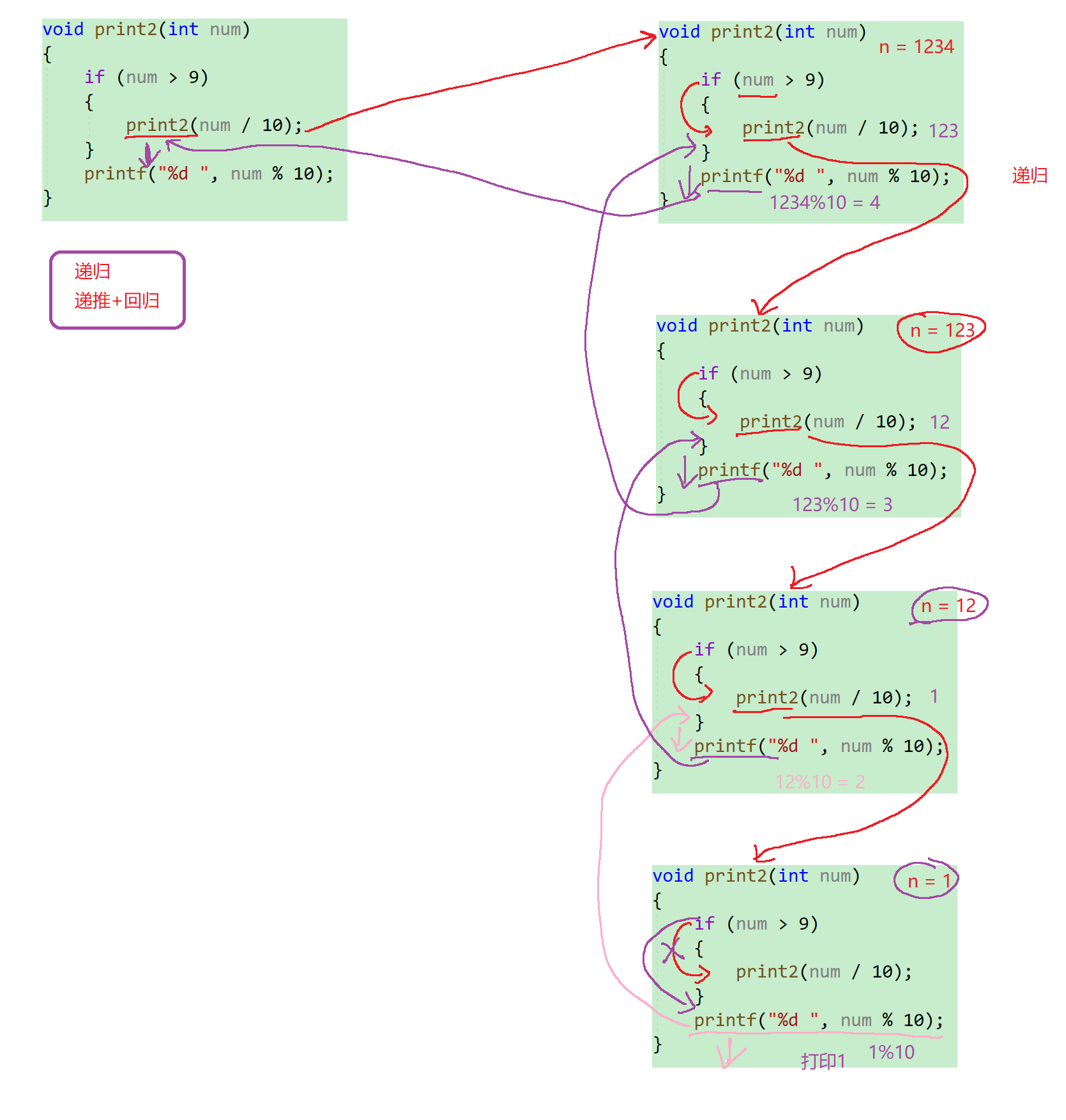 print(1234)就被拆成了print(1) 2 3 4,也就是当这个num < 10为一个个位数时,就做一个打印,否则的话就不断将其以十分之一倍得进行缩小。我们将其转化为代码的形式就【一目了然】了 - 可以看到,这里是使用到了一个递归的逻辑,上面说到递归都是具有结束条件的,若是不符合的话就层层递归下去,知道当前传入的num值为个位数为止才进行一个回调