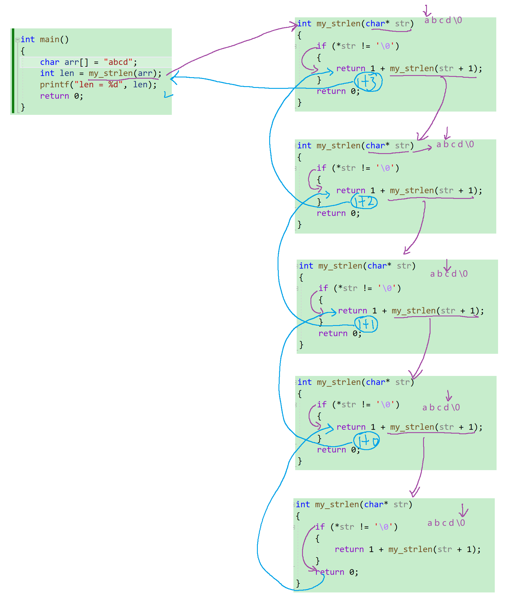 my_strlen(abc)我们可以拆成1 + my_strlen(bc) - 对于