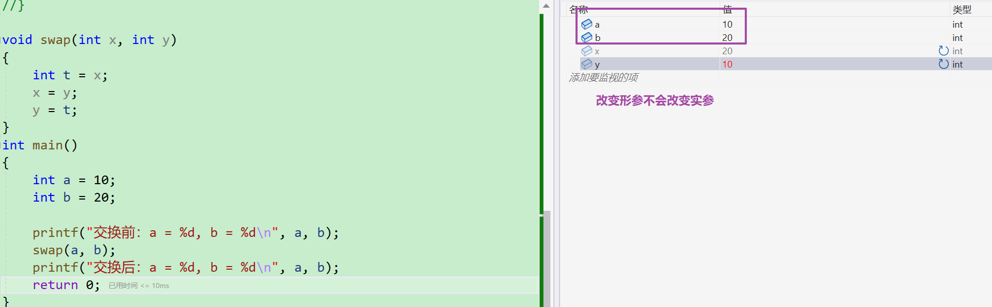 - 来看一下运行结果。可以看到两个数并没有发生交换