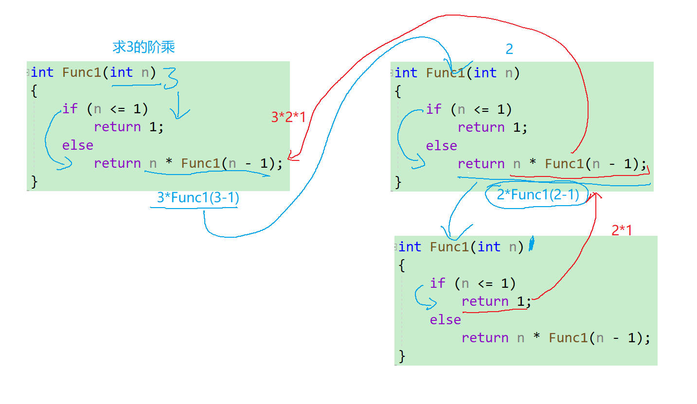 - 也就是当【n <= 1】时,即0的阶乘和1的阶乘最后都是1,当【n >= 2】时,最后的结果就是n去乘以它减1的阶乘,于是我们就可以得出递归的代码
