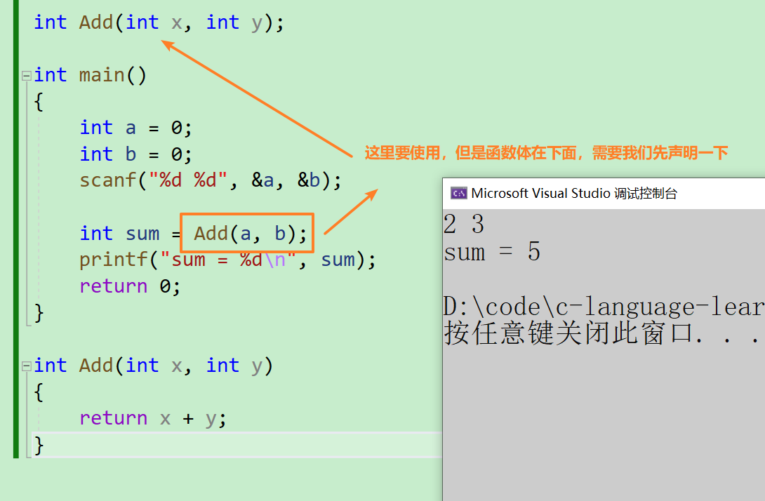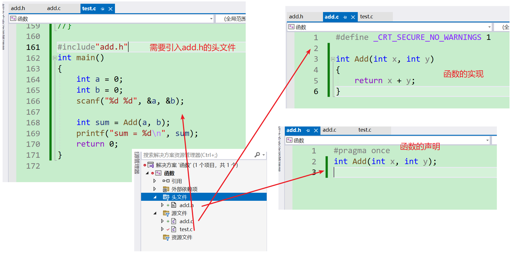 - 对于上面的代码,我们可以对其做一个分解,将【add】这个功能单独放到一个.c的文件中,然后再写一个.h的文件去声明一下这个函数。因为在日常的项目工程中,是有很多程序员一起写代码的,但是他们不可能在一个.c文件中一起书写,也不能等一个人写好之后另一个人再接着写,这样就会降低开发效率