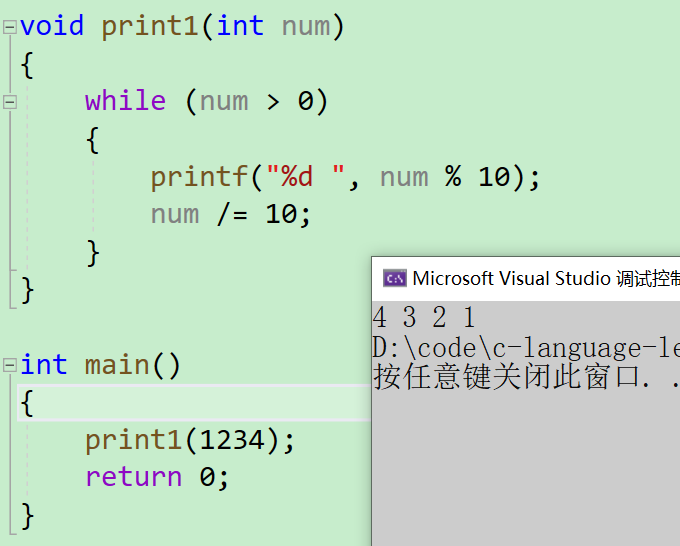- 在之前我们学习分支和循环的时候有做过类似的题目,那个时候我们是利用取余【%】和整除【/】倒着打印一个数字的每个数位,也就是下面这段代码