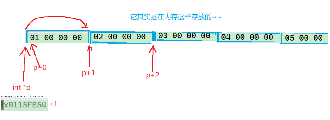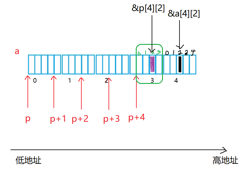 - p+1是跳过4个元素,p+4就来到了第三行