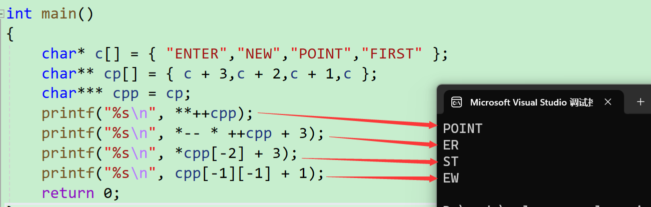 - 首先 ++cpp,cpp就会访问一个char*类型的元素,也就是这个cp数组的第二行,解引用就拿到了c+2这个地址,那么我们就可以顺着这个地址找到了c数组所在的这行地址,解引用就是拿到了c数组存放的内容,以%s打印结果就是