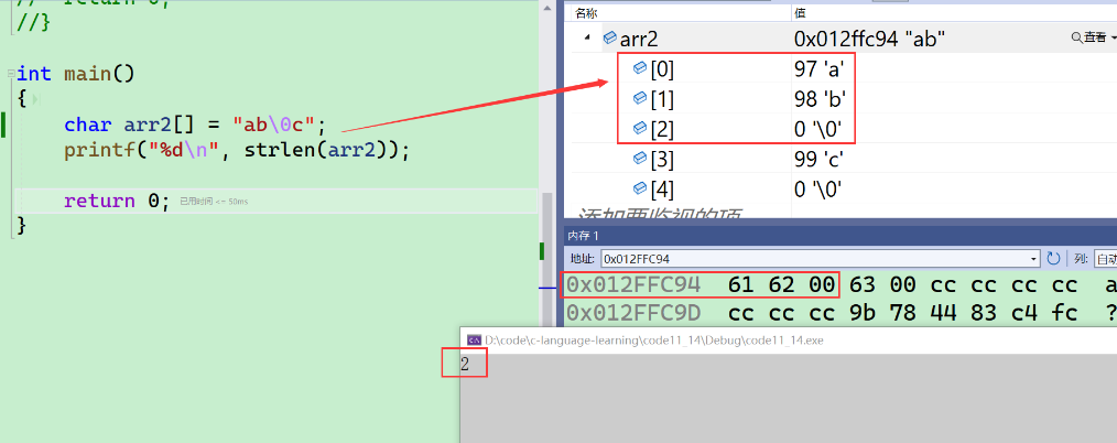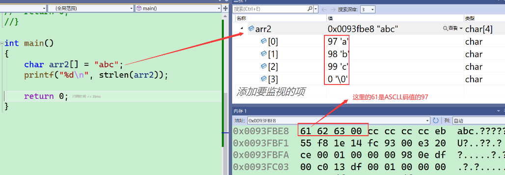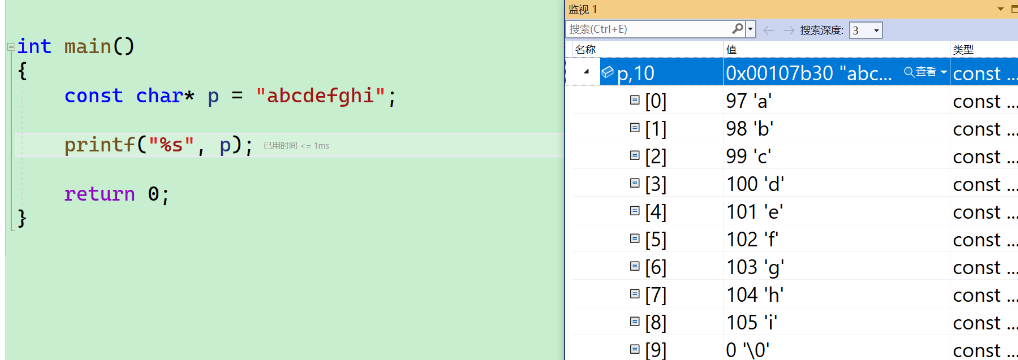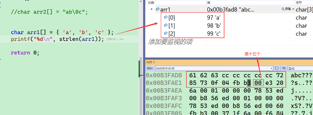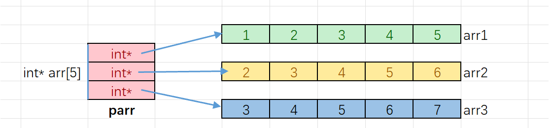 - 首先定义了一个指针数组,里面放了三个字符串,每个元素是char*,每个元素都保存着字符串的首字母