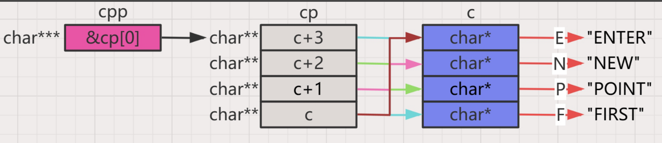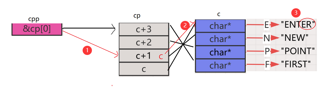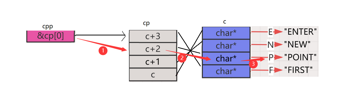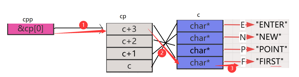 - 又有一个三级字符指针指向了二级指针数组cp的首元素地址,即第一行的地址