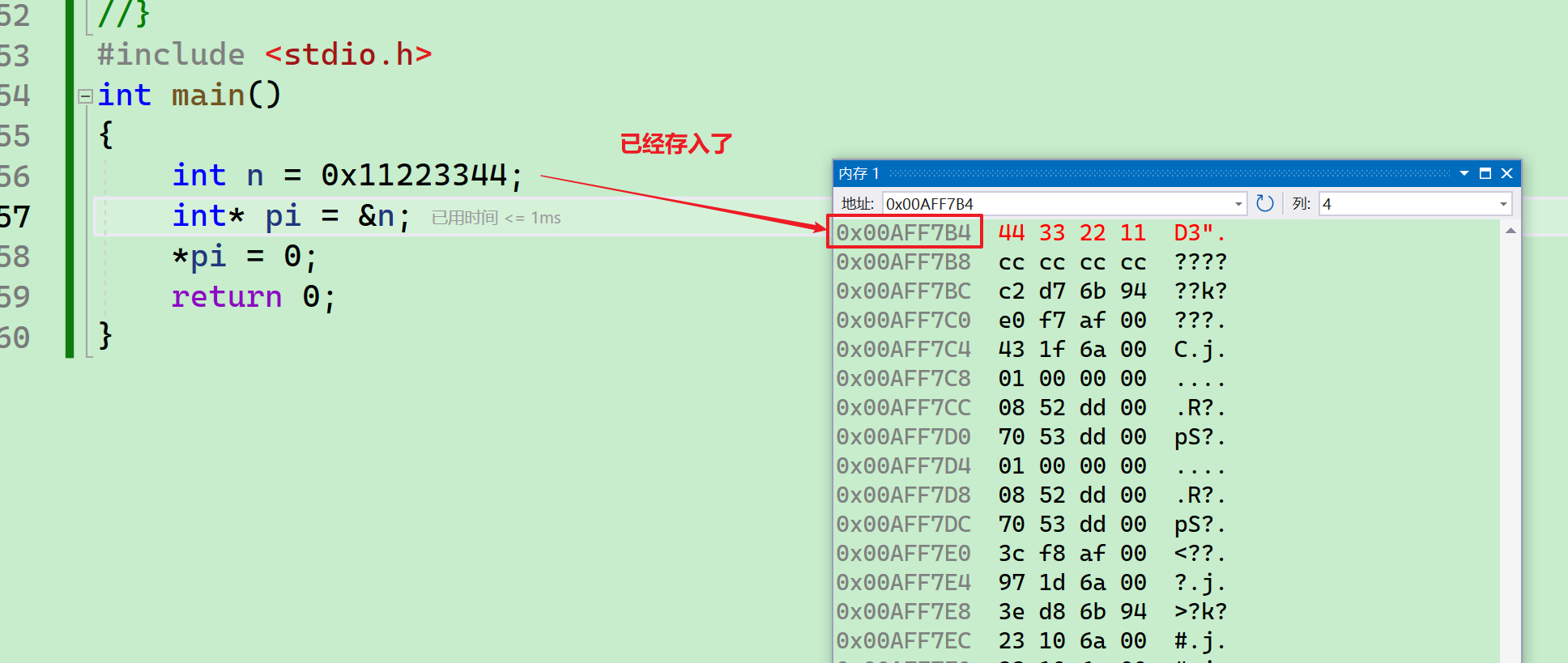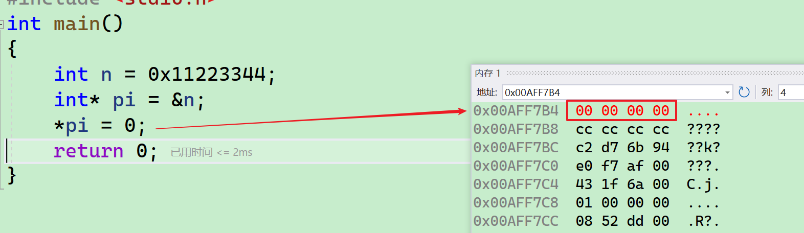 要向内存申请4个字节的空间,存放数据0