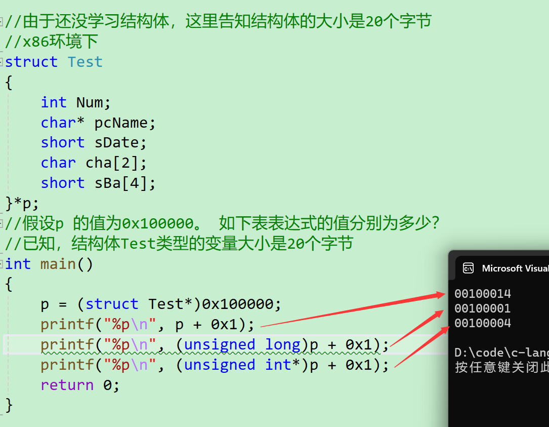 p + 0x1结构体指针+1是跳过一个结构体的大小20,是0x100020吗?不是,而是0x100014,因为这个是16进制的(unsigned long)p + 0x1指针p强制类型转换成(unsigned long),整形+1是加1结果是0x100001(unsigned int*)p + 0x1指针p强制类型转换成(unsigned int*),整形指针+1跳过4个字节,结果是0x100004- 最后我们需要以