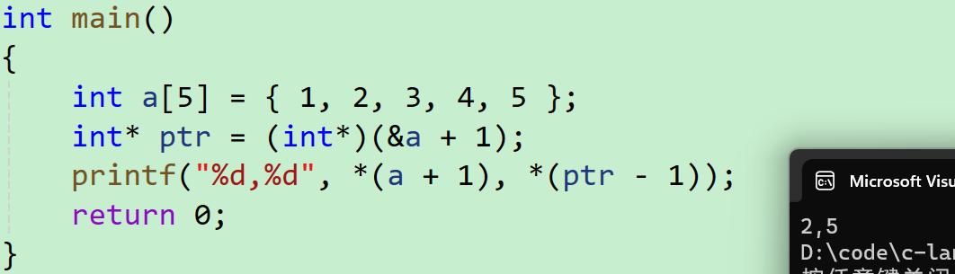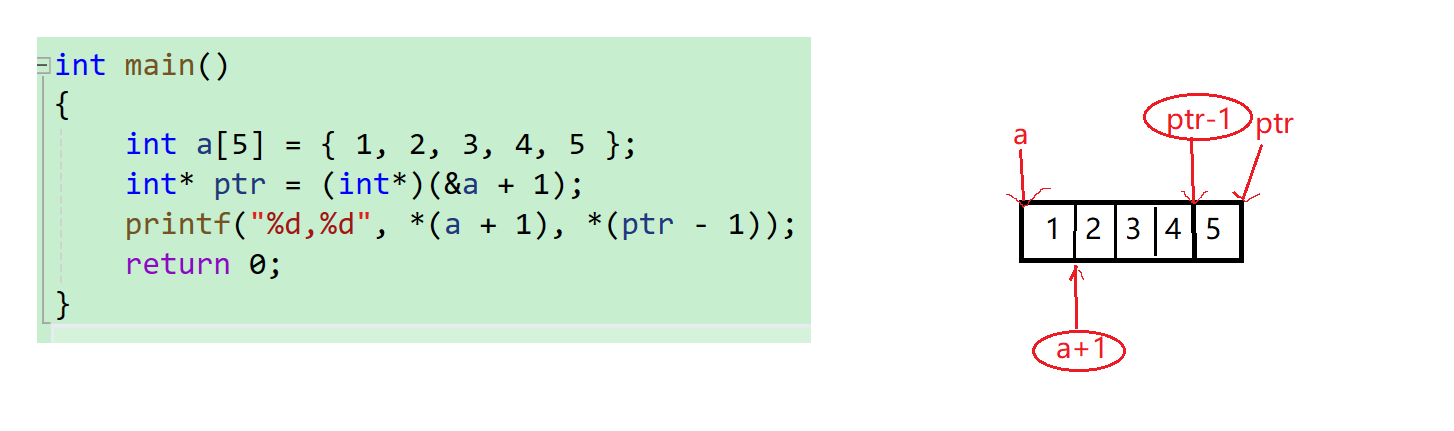 *(a+1)首先a是在数组的第一个元素,因为没有&,然后加1是跳过一个元素的大小,就来到了元素2的位置*(ptr - 1)ptr刚刚是到了5的后面,然后-1就指向了5,然后解引用就打印出5
