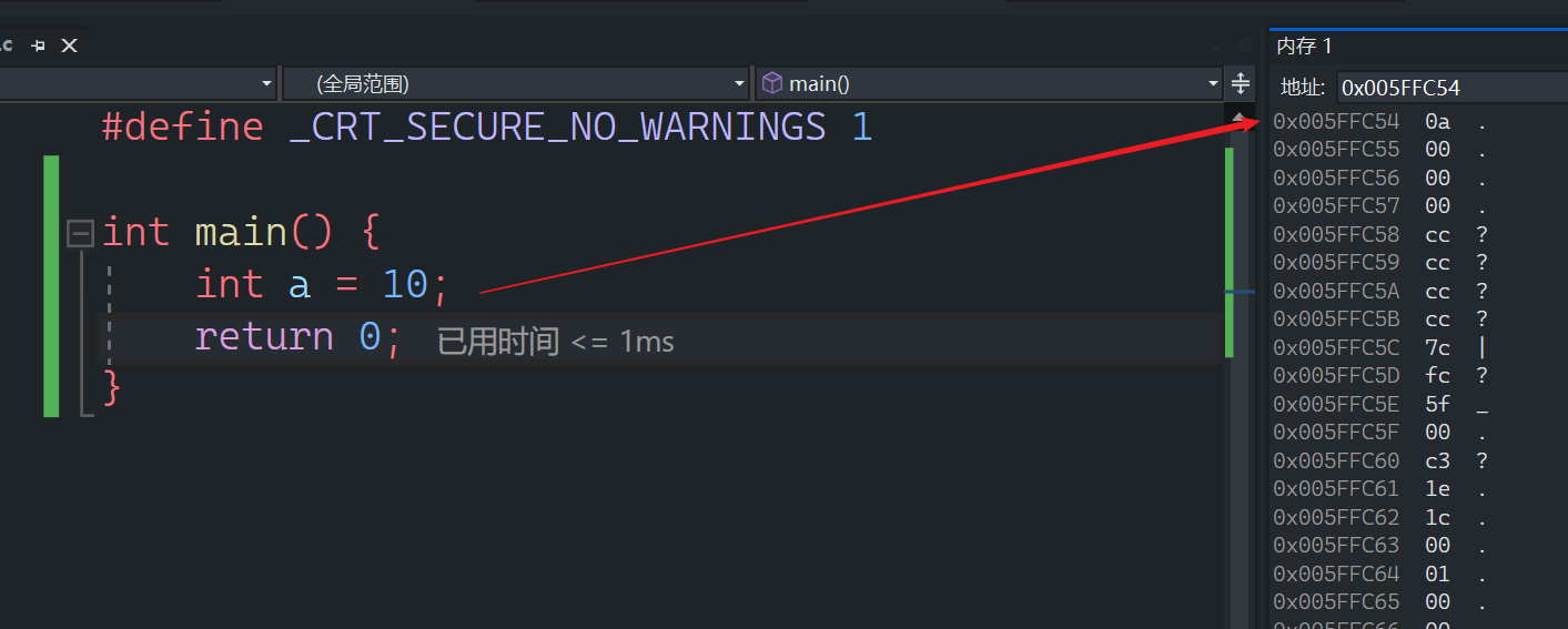 - 比如,上述的代码就是创建了整型变量a,内存中申请4个字节,用于存放整数10,其中每个字节都有地址,上图中4个字节的地址分别是:
