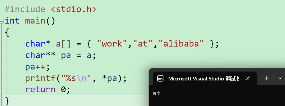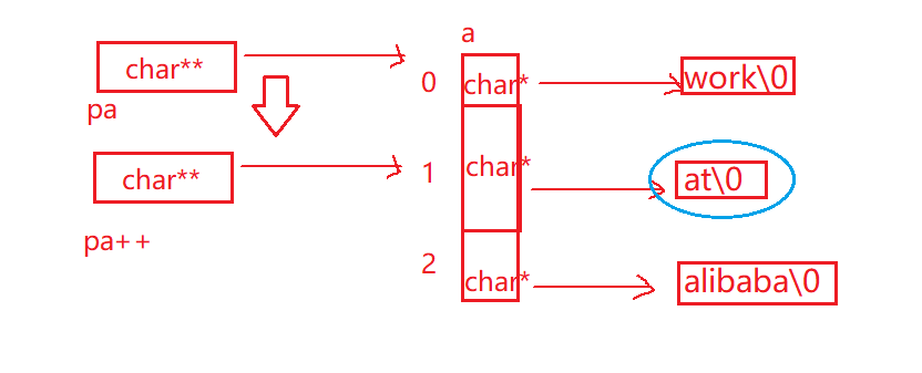- 然后还有一个二级指针,然后pa++,原来的pa是指向了数组的首地址,++就加了一个char类型,就访问到了