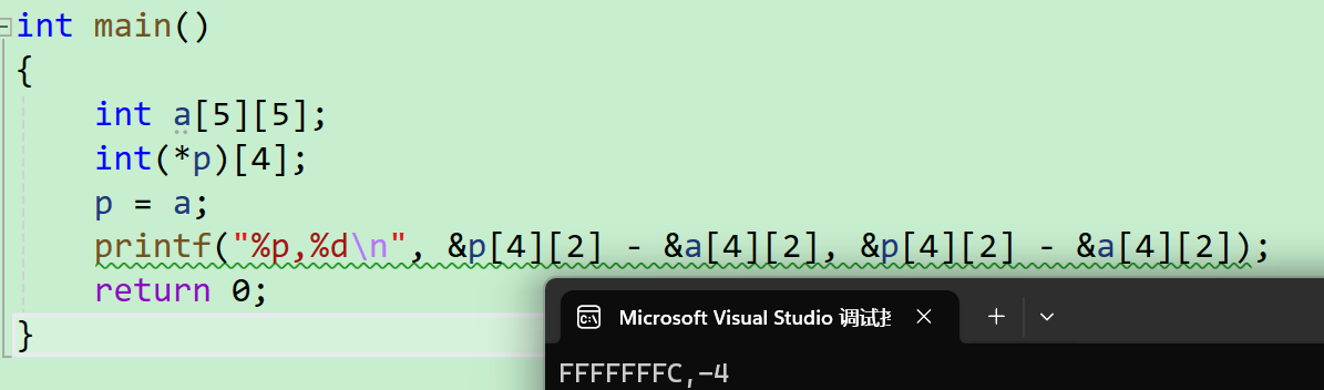 printf( "%p,%d\n", &p[4][2] - &a[4][2], &p[4][2] - &a[4][2]);