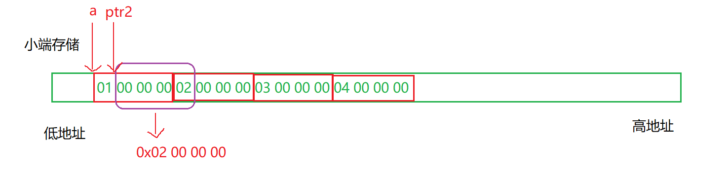 int类型,然后加1,加的是内存中一个字节的位置,然后赋给了ptr2,ptr2是整形指针,向后访问4个字节,又因为是小端存储,打印是以%x打印的,所以结果是2000000