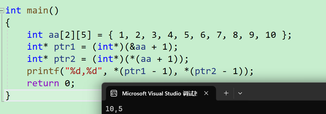 - 取地址aa数组是取出了整个二维数组的地址,然后+1,是跳过整个数组,强制类型转换成了整形赋值给了