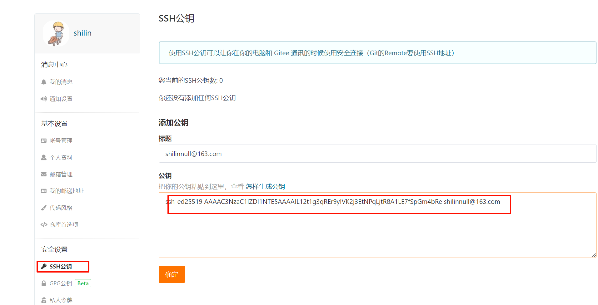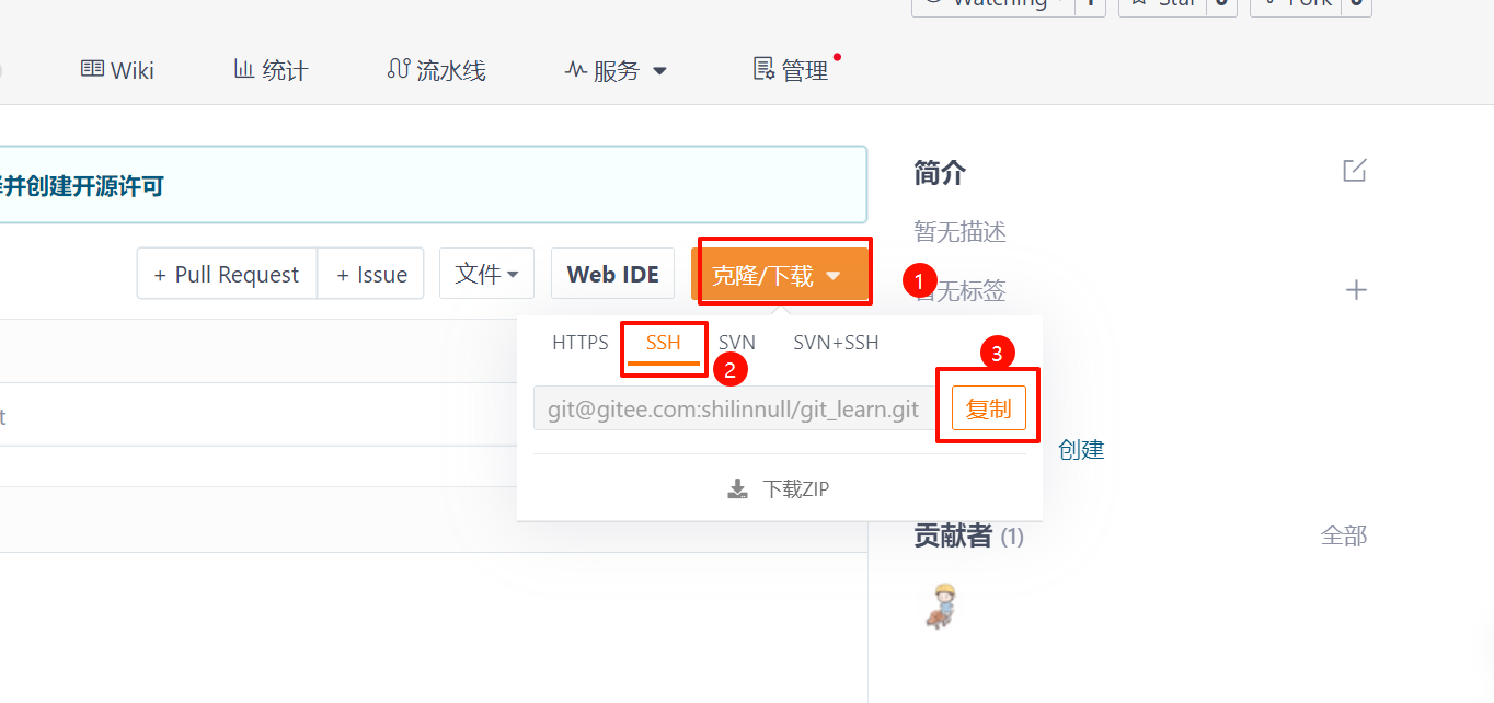 ssh来配置一下- 使用ssh方式克隆仓库,由于我们没有添加公钥到远端库中,所以会克隆失败,这里就不演示了,接下来我们就开始配置一下如何将公钥添加