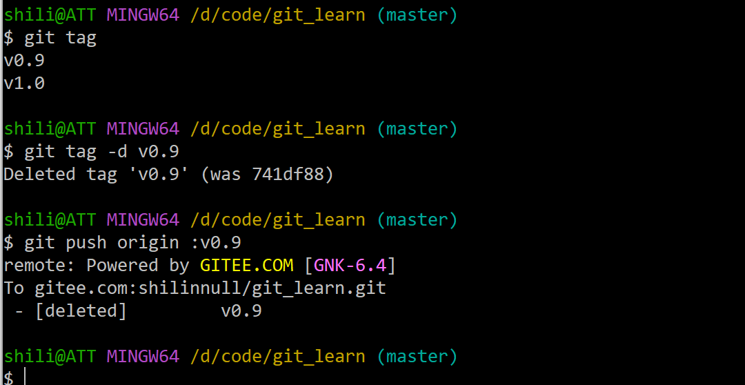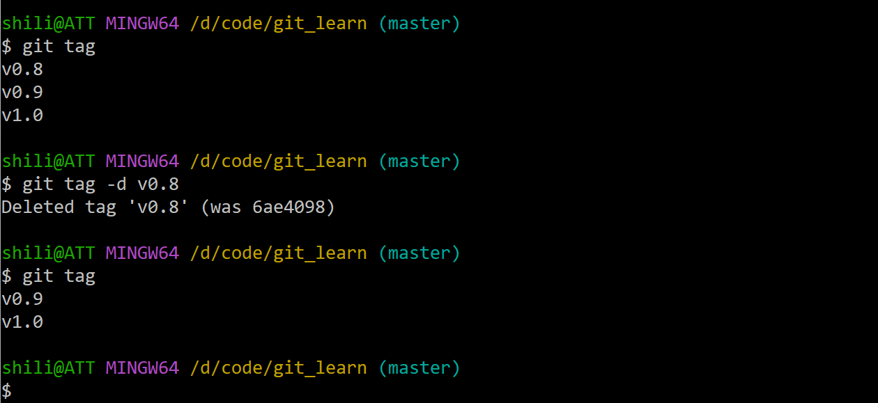- 因为创建的标签都只存储在本地,不会⾃动推送到远程。所以,打错的标签可以在本地安全删除。