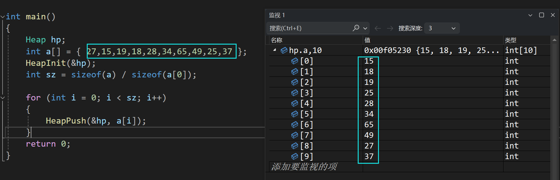 int a[] = { 27,15,19,18,28,34,65,49,25,37 };