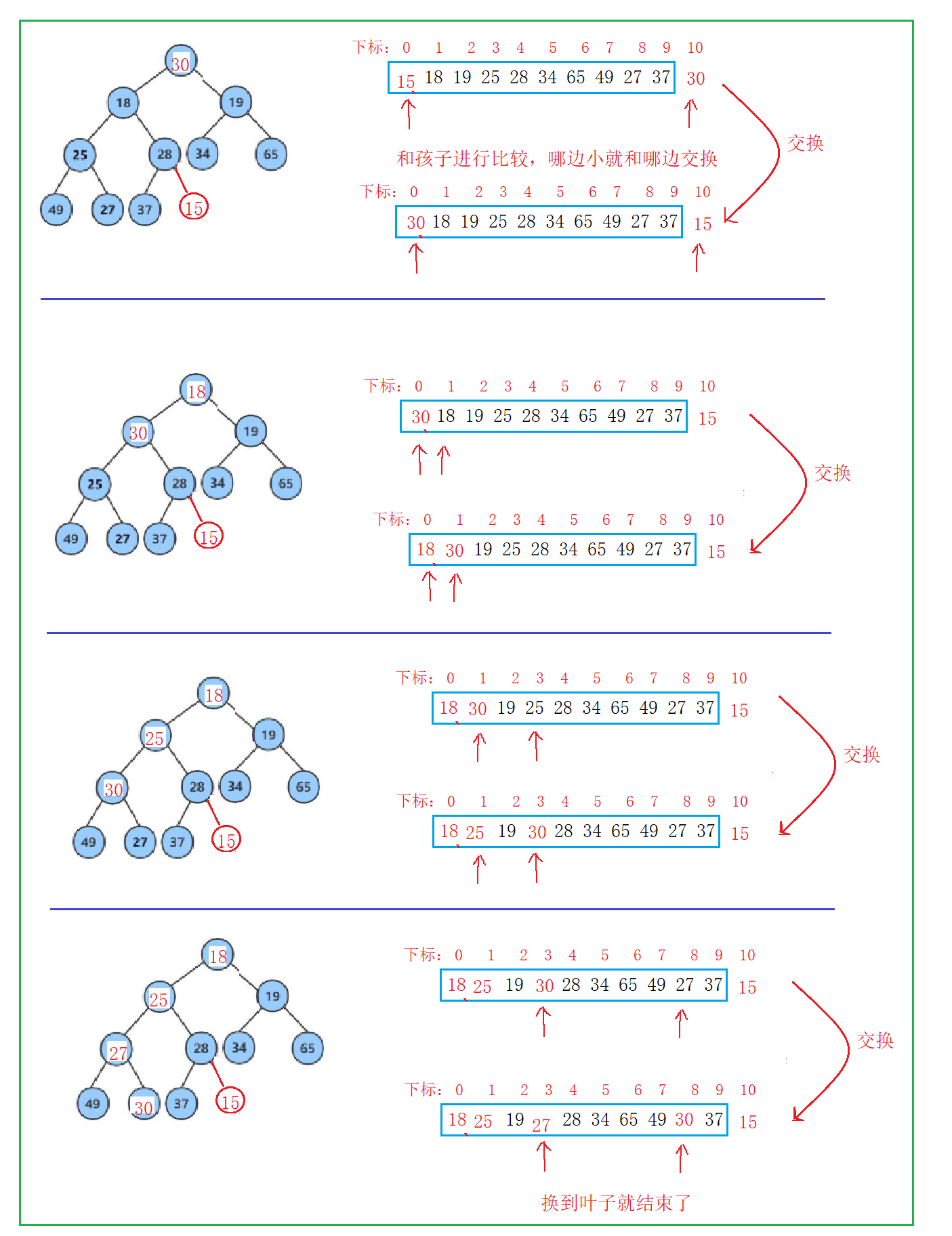 以上是小堆的算法实现,大堆也是相似的,只需要改一改大小于号就可以