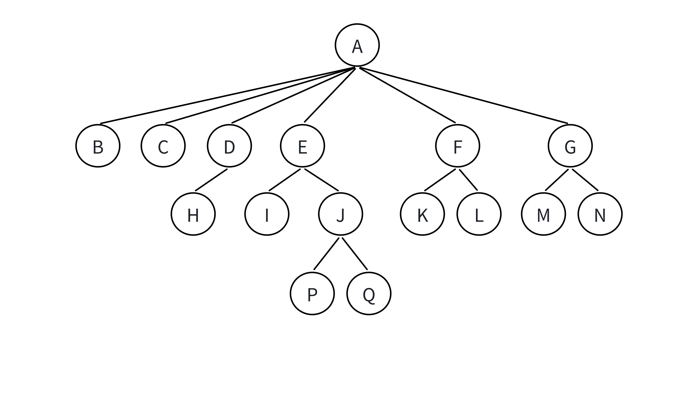 路径:一条从树中任意节点出发,沿父节点-子节点连接,达到任意节点的序列;比如A到Q的路径为:A-E-J-Q;H到Q的路径H-D-A-E-J-Q